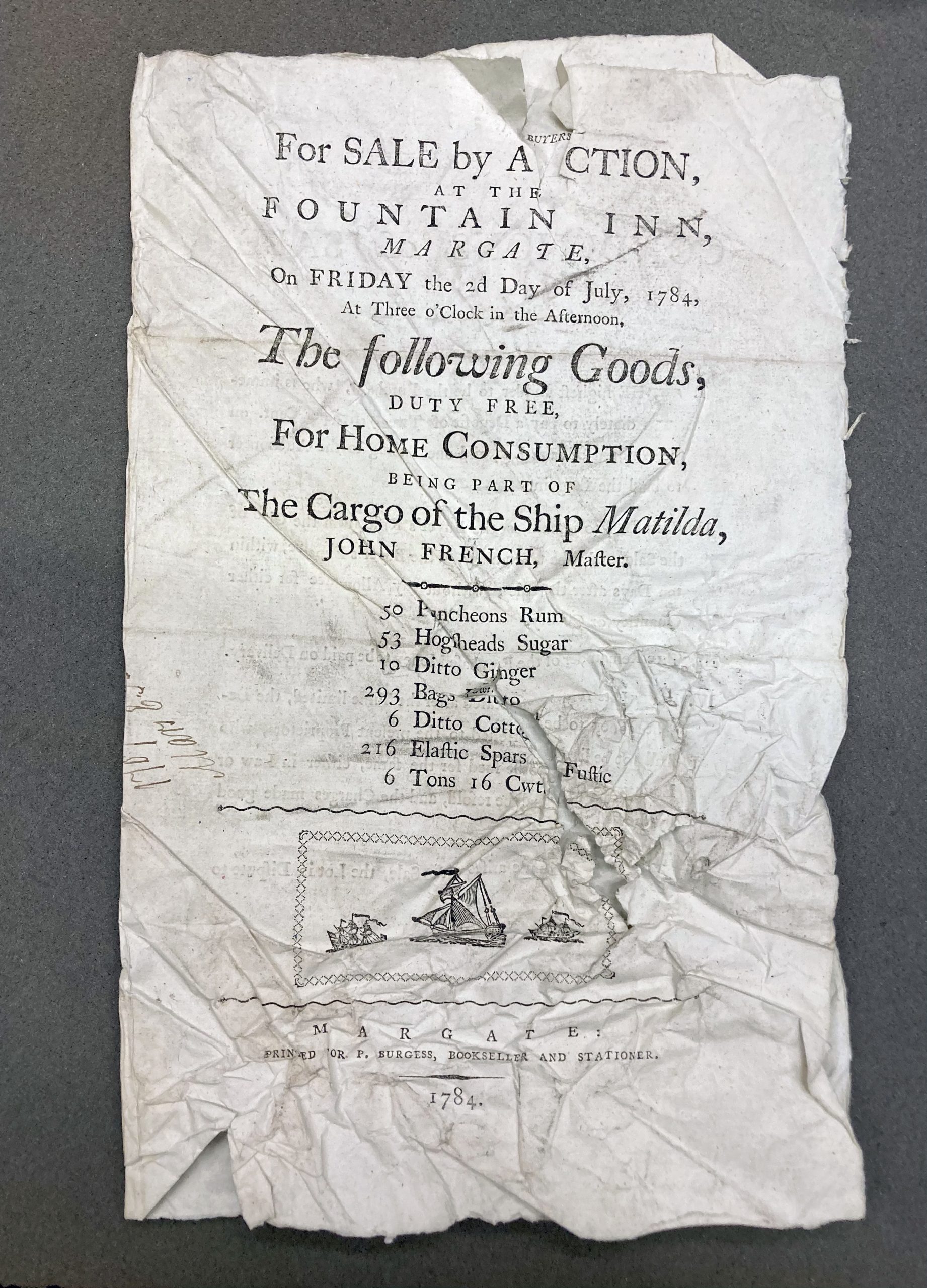 A pamphlet for auction of goods made by enslaved people from St. Croix, salvaged from the wreck of the Prince Frederic in Margate 1782.