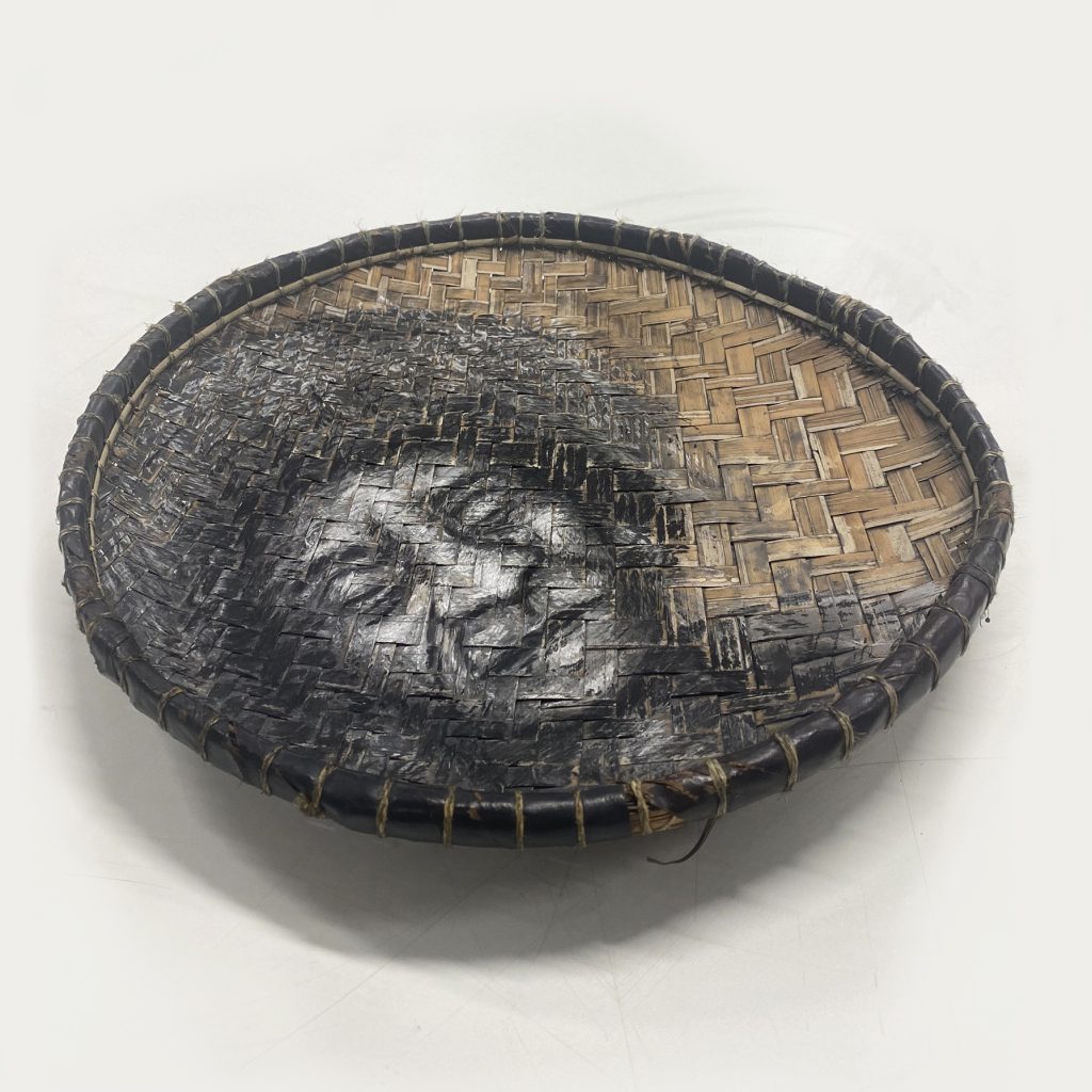 These woven baskets were traditionally used in the Indian Ocean Creole islands for sorting rice, spices or other cooking ingredients, salting fish, and carrying or displaying objects for sale. They were also used in ‘gri-gri’ (an Indian Ocean Creole practice of spirituality, magic, herbalism and divination) to hold ingredients used in spells and as a surface for casting shells, bone, seeds, coral, stone, dominos, cards and other objects used in divination. This one belonged to my great grandmother who worked as a fortune-teller. It was brought with my family when they migrated to the UK before I was born. When I grew up it was on the wall in my grandparents’ house, like a circular porthole to the past. I inherited it when when my grandparents passed away. I drew in it this portrait of my great-grandmother, mostly from memory, with charcoal and chalks from Margate beach.